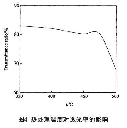 圖4為熱處理溫度對(duì)ITO薄膜透光率(λ=550nm)的影響關(guān)系曲線(xiàn)。熱處理溫度對(duì)透光率的影響在熱處理溫度為475℃之前并不大,當(dāng)熱處理溫度高于475℃之后透光率隨熱處理溫度的增高迅速下降。