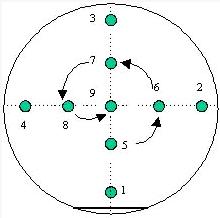其實外延片的生產(chǎn)制作過程是非常復(fù)雜的,生產(chǎn)設(shè)備基本上選用原裝進口為主;在展完外延片后,下一步就開始對LED外延片做電極(P極,N極),接著就開始用激光機切割LED外延片(以前切割LED外延片主要用鉆石刀),制造成芯片后,在晶圓上的不同位置抽取九個點做參數(shù)測試,如圖所示: