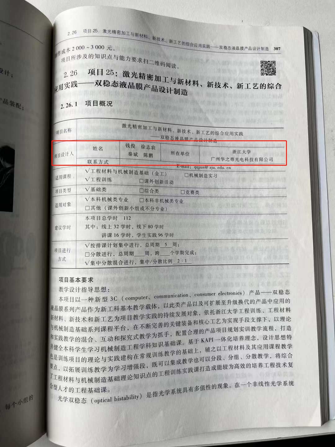 激光精密加工與新材料、新技術(shù)、新工藝的綜合應(yīng)用實(shí)踐—雙穩(wěn)態(tài)液晶膜產(chǎn)品設(shè)計制造項目是由浙江大學(xué)和廣州華之尊光電科技有限公司基于新材料、新技術(shù)、新工藝共同推出的新型教材。項目以新型3C產(chǎn)品一雙穩(wěn)態(tài)液晶膜系列產(chǎn)品作為新工科基本教學(xué)教體,項目依托浙江大學(xué)工程訓(xùn)練、工程材料與機(jī)械制造基礎(chǔ)系列課程平臺,在不斷完善的關(guān)鍵裝備和核心工藝為實(shí)現(xiàn)手段支撐下,以理論和實(shí)踐教學(xué)的混合、互動和探究式教學(xué)為抓手,配置合理的產(chǎn)品項目規(guī)劃實(shí)訓(xùn)教學(xué)流程,打造并健全本科學(xué)生學(xué)習(xí)機(jī)械制造工程學(xué)科知識基礎(chǔ)課?;贙API一體化培養(yǎng)理念,設(shè)計思想特色是訓(xùn)練項目的理論與實(shí)踐建構(gòu)在常規(guī)訓(xùn)練教學(xué)的基礎(chǔ)上,輔之以工程材料及其應(yīng)用課程教學(xué)要點(diǎn),以拓展訓(xùn)練教學(xué)為學(xué)習(xí)增強(qiáng)段,既可以集成教學(xué)也可以分段、分組、分散教學(xué),將綜合了工程材料與機(jī)械制造基礎(chǔ)理論知識點(diǎn)的工程訓(xùn)練實(shí)踐課打造成能較為高效的培養(yǎng)工程技術(shù)復(fù)合型人才的工程基礎(chǔ)課。