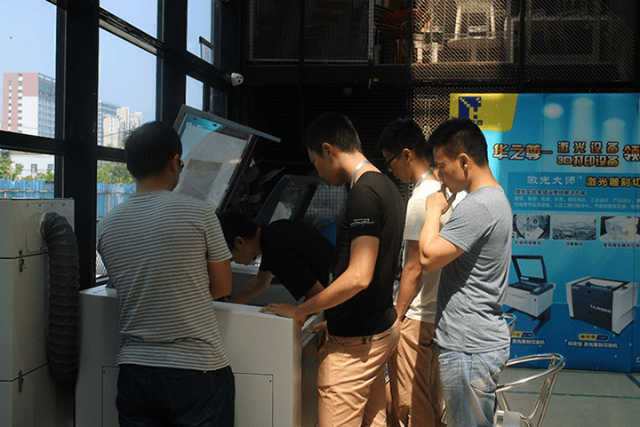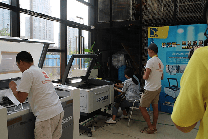 ▲.華之尊工作人員協(xié)助選手使用激光雕刻切割機(jī)