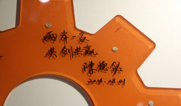 ▲.海峽兩岸關(guān)系協(xié)會(huì)會(huì)長(zhǎng)陳德銘在活動(dòng)現(xiàn)場(chǎng)題字“兩岸一家,共創(chuàng)共贏”