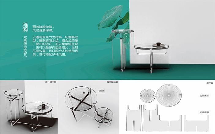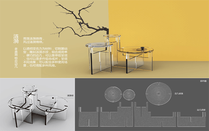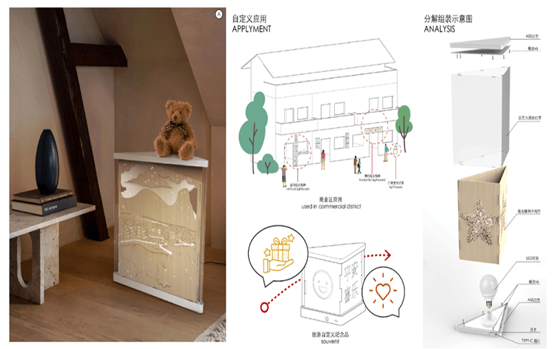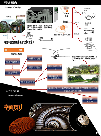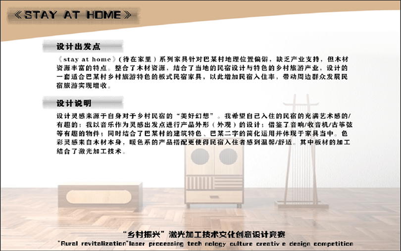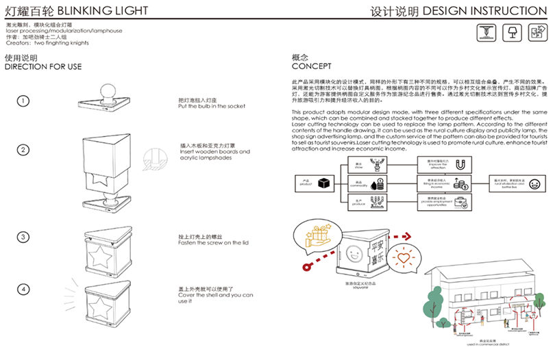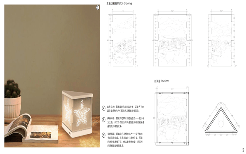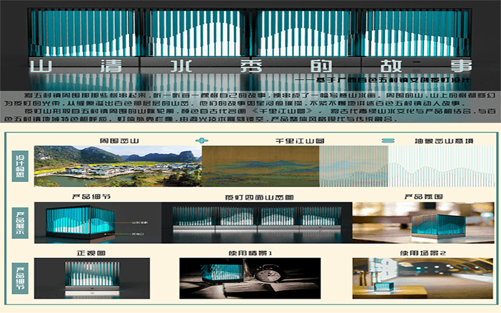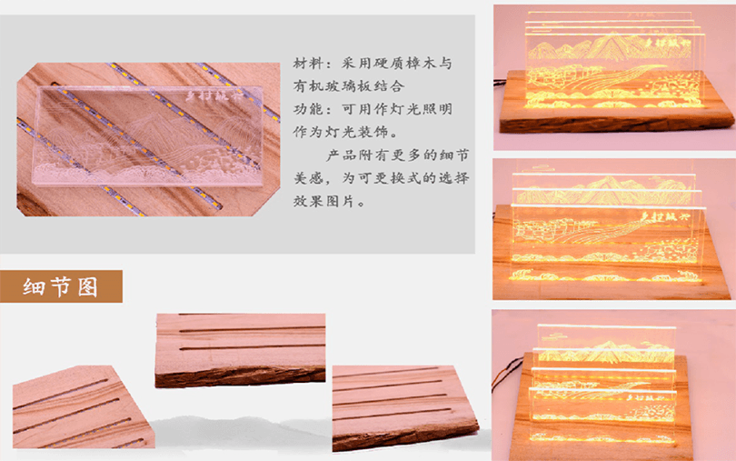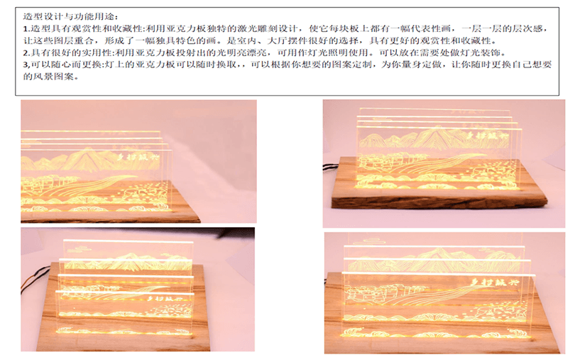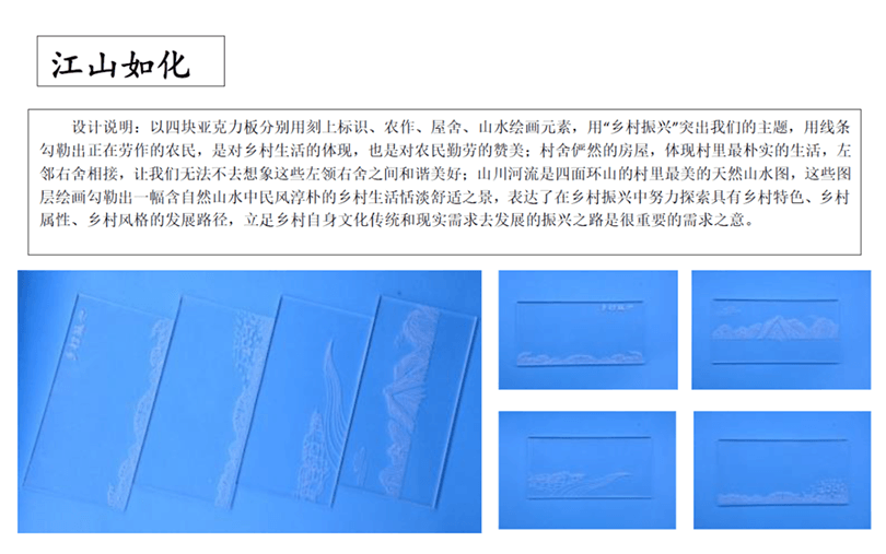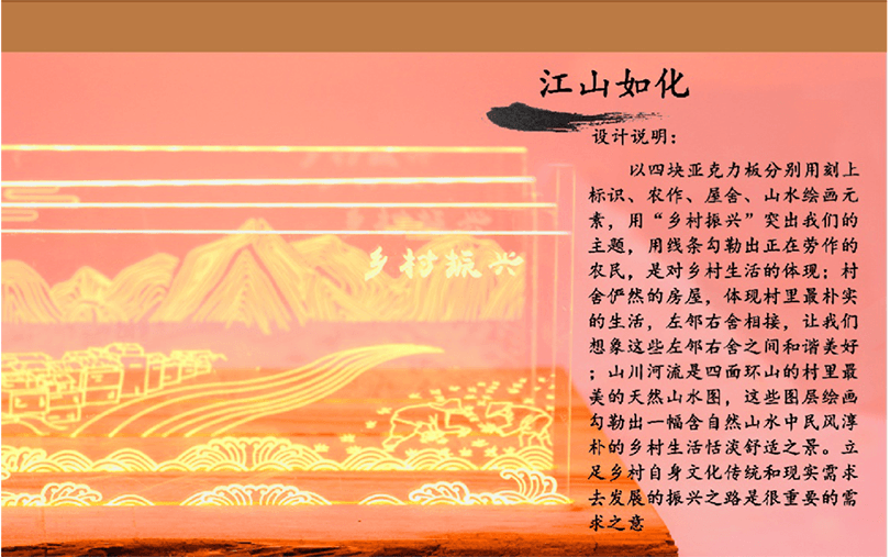 設(shè)計(jì)說明:四塊亞克力板上刻有標(biāo)牌、農(nóng)家、房屋和山水畫等元素。線條勾勒出農(nóng)民和別墅,反映出簡(jiǎn)單的鄉(xiāng)村生活。鄰里相見,表現(xiàn)出和諧美好的人際關(guān)系。山脈、河流代表了寧?kù)o舒適的鄉(xiāng)村生活。根據(jù)自身的文化傳統(tǒng)和農(nóng)村的實(shí)際需要,探索鄉(xiāng)村振興之路。