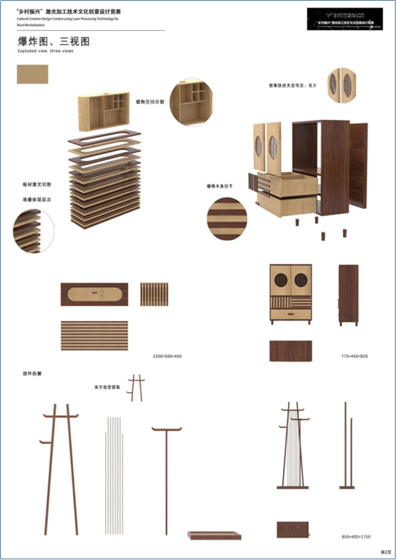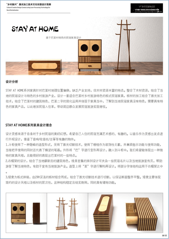 AT HOME系列家具針對巴某村地理位置偏僻、缺乏產(chǎn)業(yè)支持,但木材資源豐富的特點(diǎn),整合了木材資源,結(jié)合了當(dāng)?shù)氐拿袼拊O(shè)計(jì)與特色的鄉(xiāng)村旅游產(chǎn)業(yè),設(shè)計(jì)一套適合巴某村鄉(xiāng)村旅游特色的板式民宿家具。板材的加工結(jié)合了激光加工技術(shù)、巴某村的建筑特色和“巴某”二字的簡化,運(yùn)用并體現(xiàn)于家具當(dāng)中。以此增加民宿入住率,帶動(dòng)周邊群眾發(fā)展民宿旅游實(shí)現(xiàn)增收。