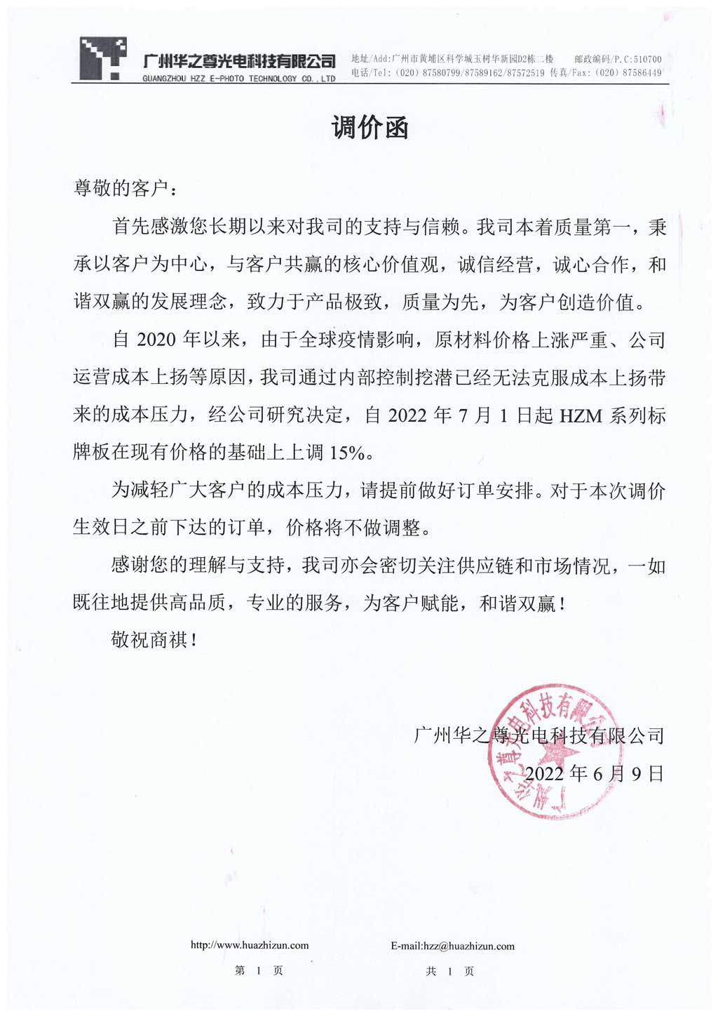 自2020年以來,由于全球疫情影響,原材料價格上漲嚴重、公司運營成本上揚等原因,我司通過內(nèi)部控制挖潛已經(jīng)無法克服成本上揚帶來的成本壓力,經(jīng)公司研究決定,自2022年7月1日起HZM系列標牌板在現(xiàn)有價格的基礎上上調(diào)15%。