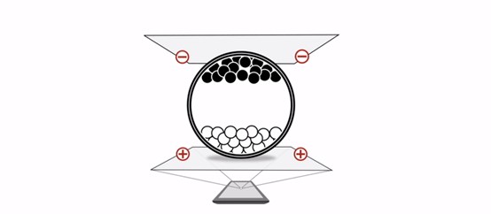 電子墨水屏表面附著無數(shù)個體積很小的“微膠囊”,每一個微膠囊里面都有無數(shù)個帶負電荷的白色和帶正電荷的黑色顆粒,白黑粒子在電場的作用下會上下運動,從而讓我們看到屏幕上的黑白圖像,這種屏幕,我們都叫黑白墨水屏。