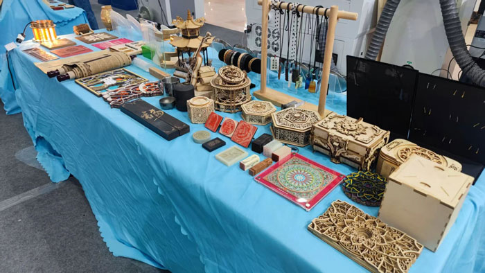 華之尊激光此次展出了多軸激光焊接/清洗機(jī)、激光打標(biāo)機(jī)、激光雕切一體機(jī)等多個(gè)領(lǐng)域激光設(shè)備,這些設(shè)備廣泛應(yīng)用于所有藝術(shù)設(shè)計(jì)類(lèi)專(zhuān)業(yè),如:建筑裝飾、工藝美術(shù)、服裝服飾、陶瓷藝術(shù)、產(chǎn)品設(shè)計(jì)、平面視覺(jué)等各類(lèi)專(zhuān)業(yè)。以下是華之尊激光在展會(huì)上的一些創(chuàng)新展示: