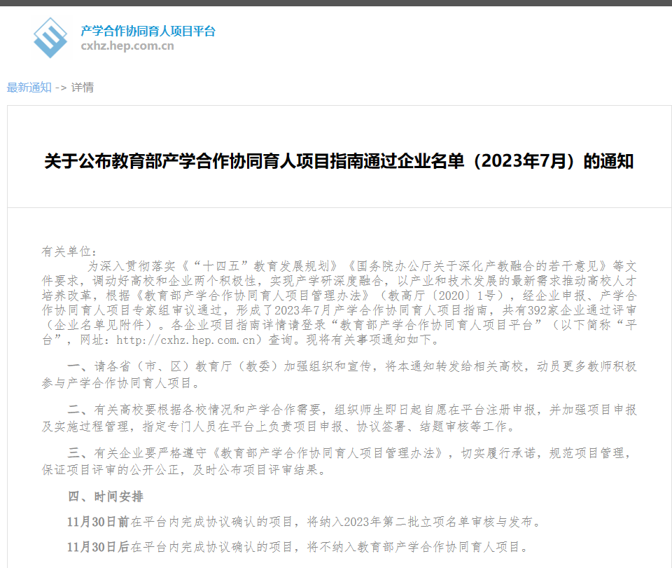 2023年11月30日后在平臺內(nèi)完成協(xié)議確認的項目,將不納入教育部產(chǎn)學合作協(xié)同育人項目。